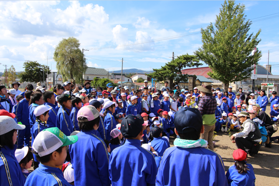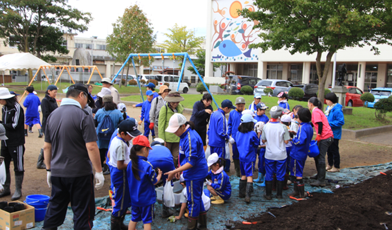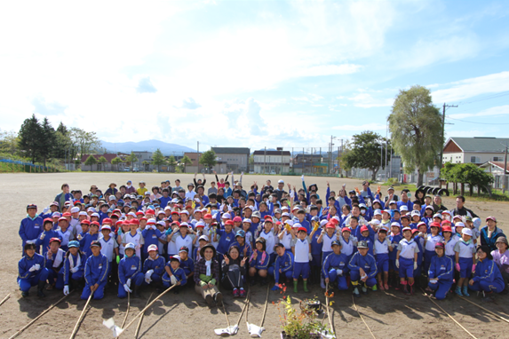 参加人数 | 300名ほど 大畑小学校全校生徒と職員、PTAを中心としての植樹祭 全校生徒223名 教師職員24名 PTA等20名程 GEMBU等30名程 班編成:14班(1班20名から21名) 参加賞(植樹祭てぬぐい お菓子) |